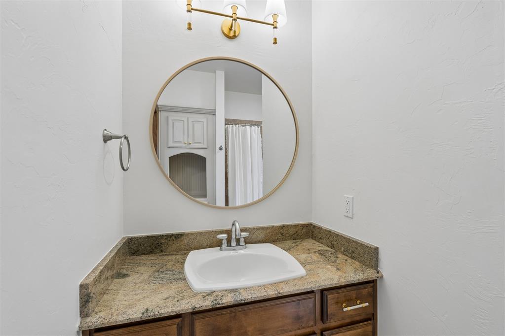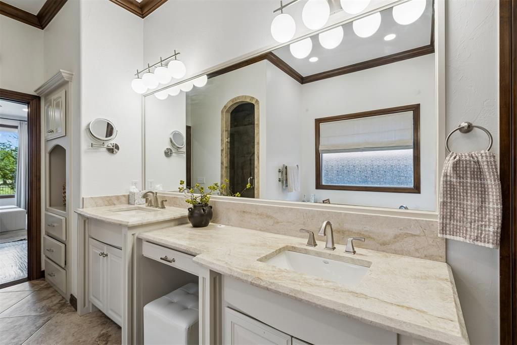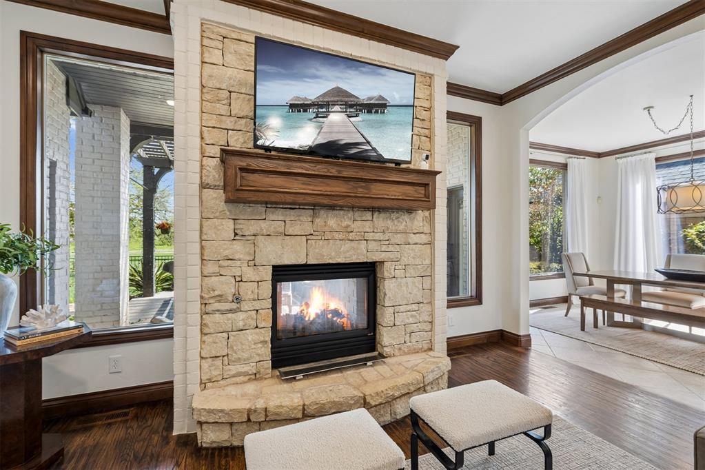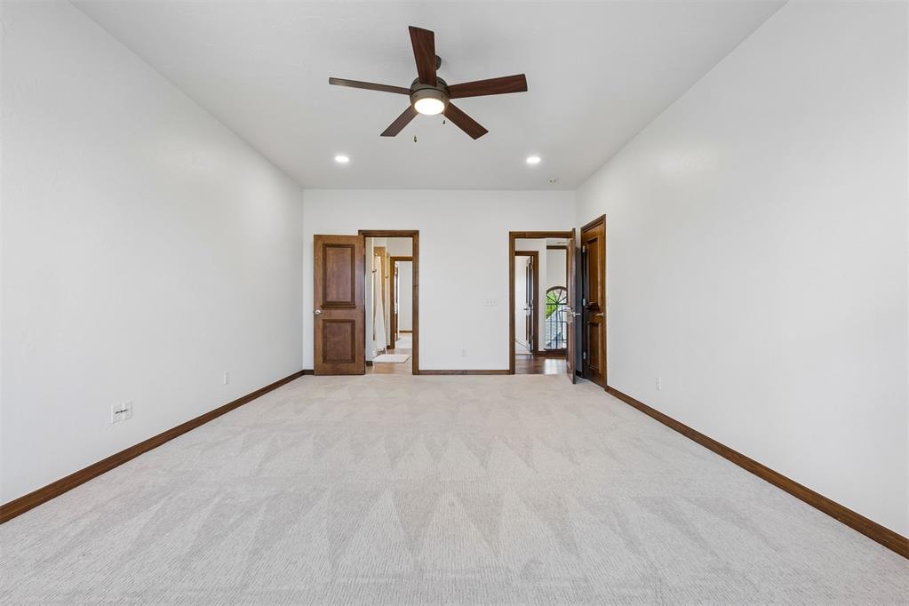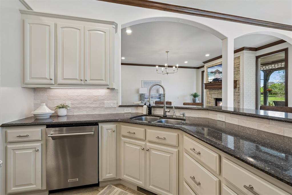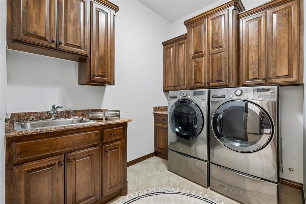 Oversized garage with epoxy floors and 5x7 in-ground storm shelter. Covered back patio with outdoor fireplace overlooking the course.