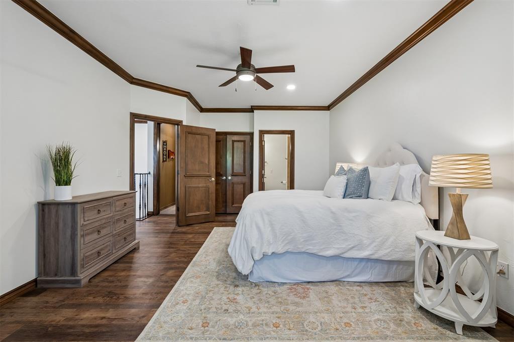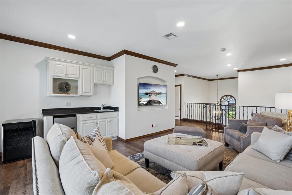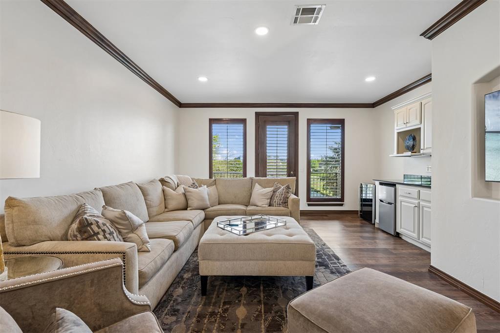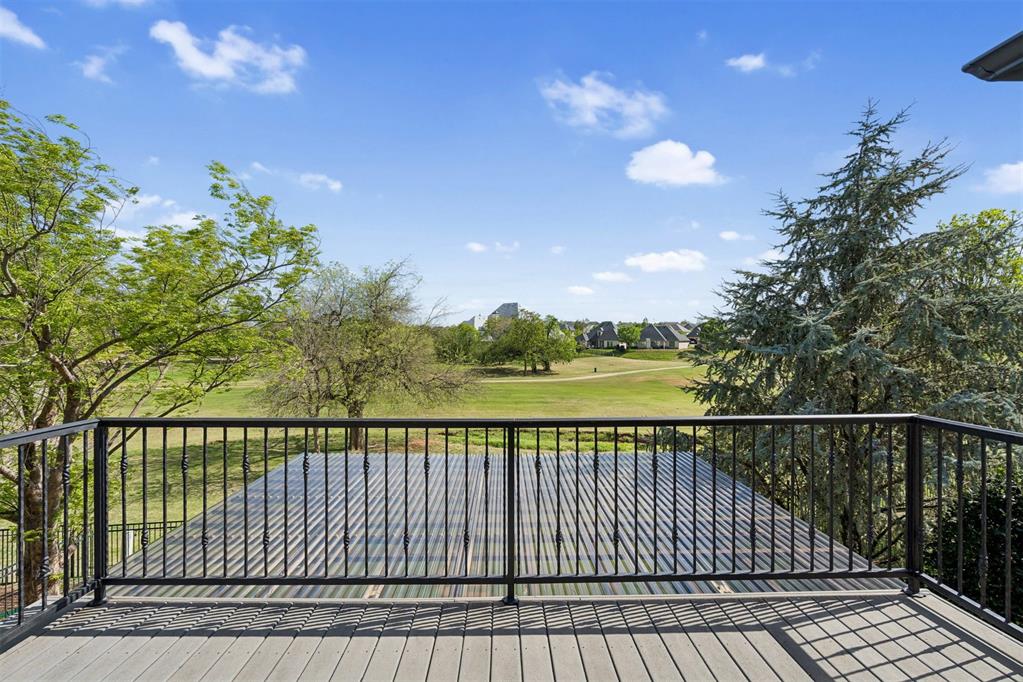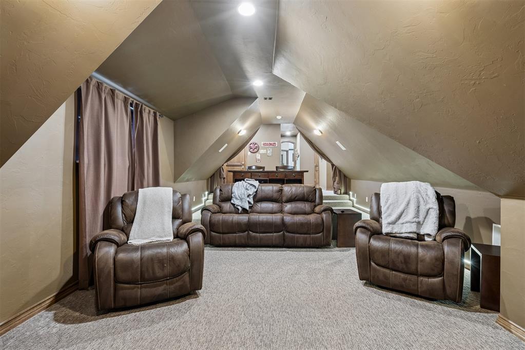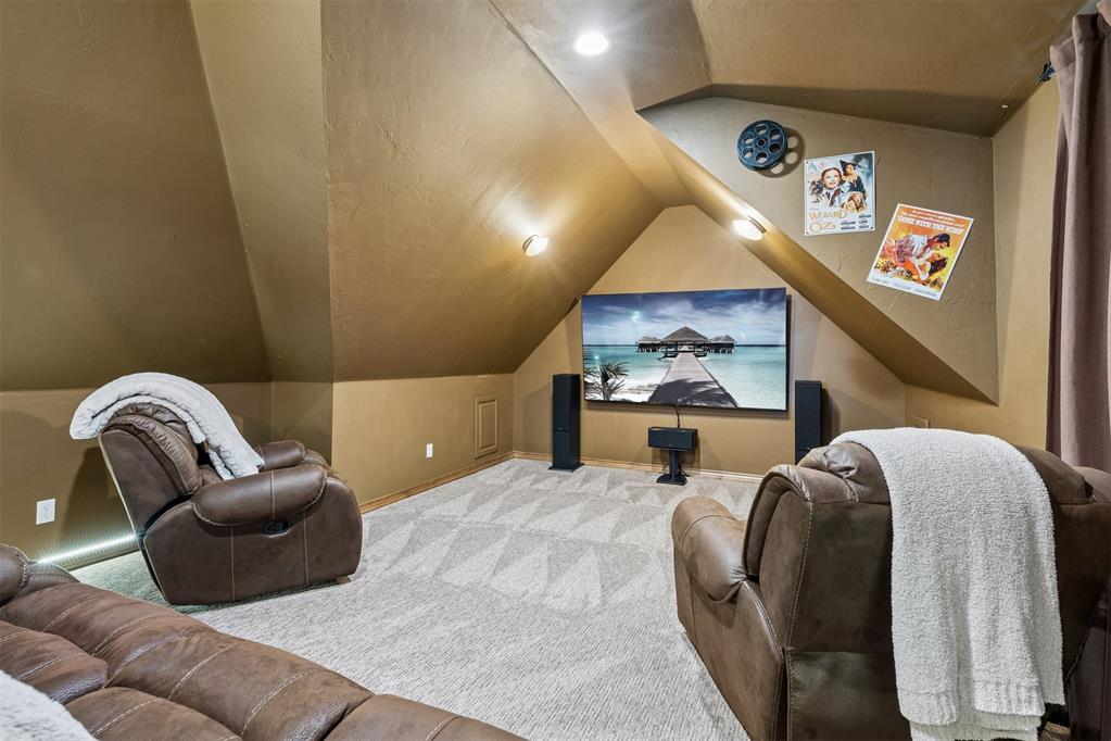 Upstairs features a spacious bonus room with mini kitchen, microwave, mini refrigerator, and sink, plus balcony access with panoramic golf course views. Large theater room with two attic access points, including one with expansion potential.